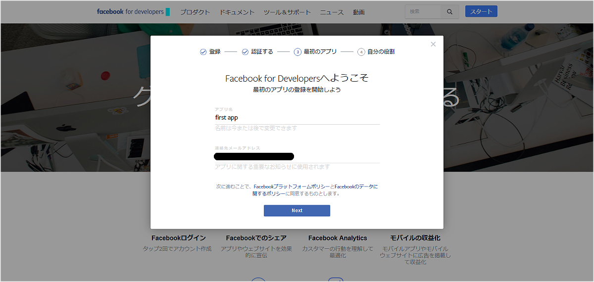 「アプリ名」と「連絡先メールアドレス」を入力して、「Next」ボタンをクリックします。