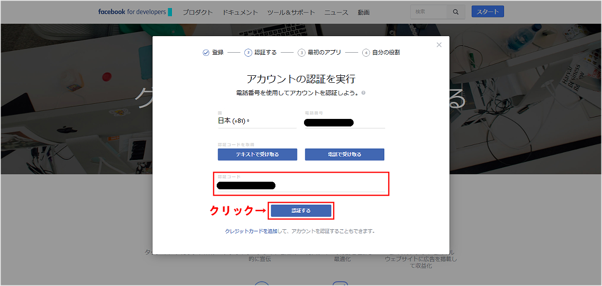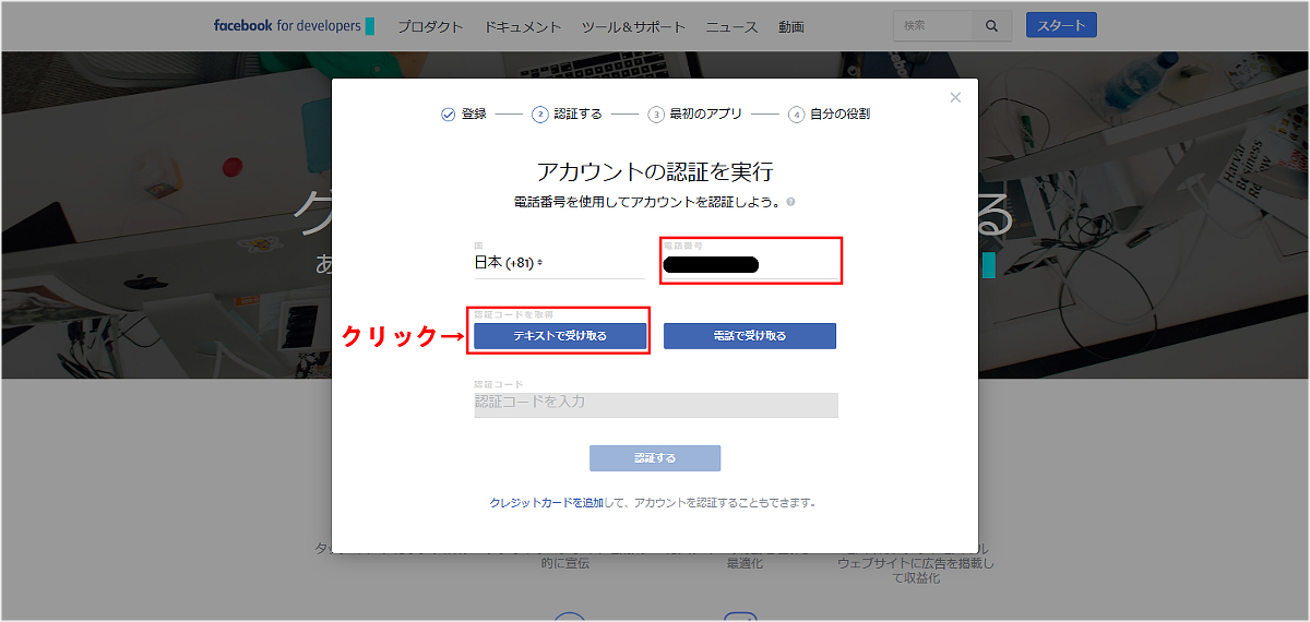 入力した「電話番号」宛てに「認証コード」を受け取ります。