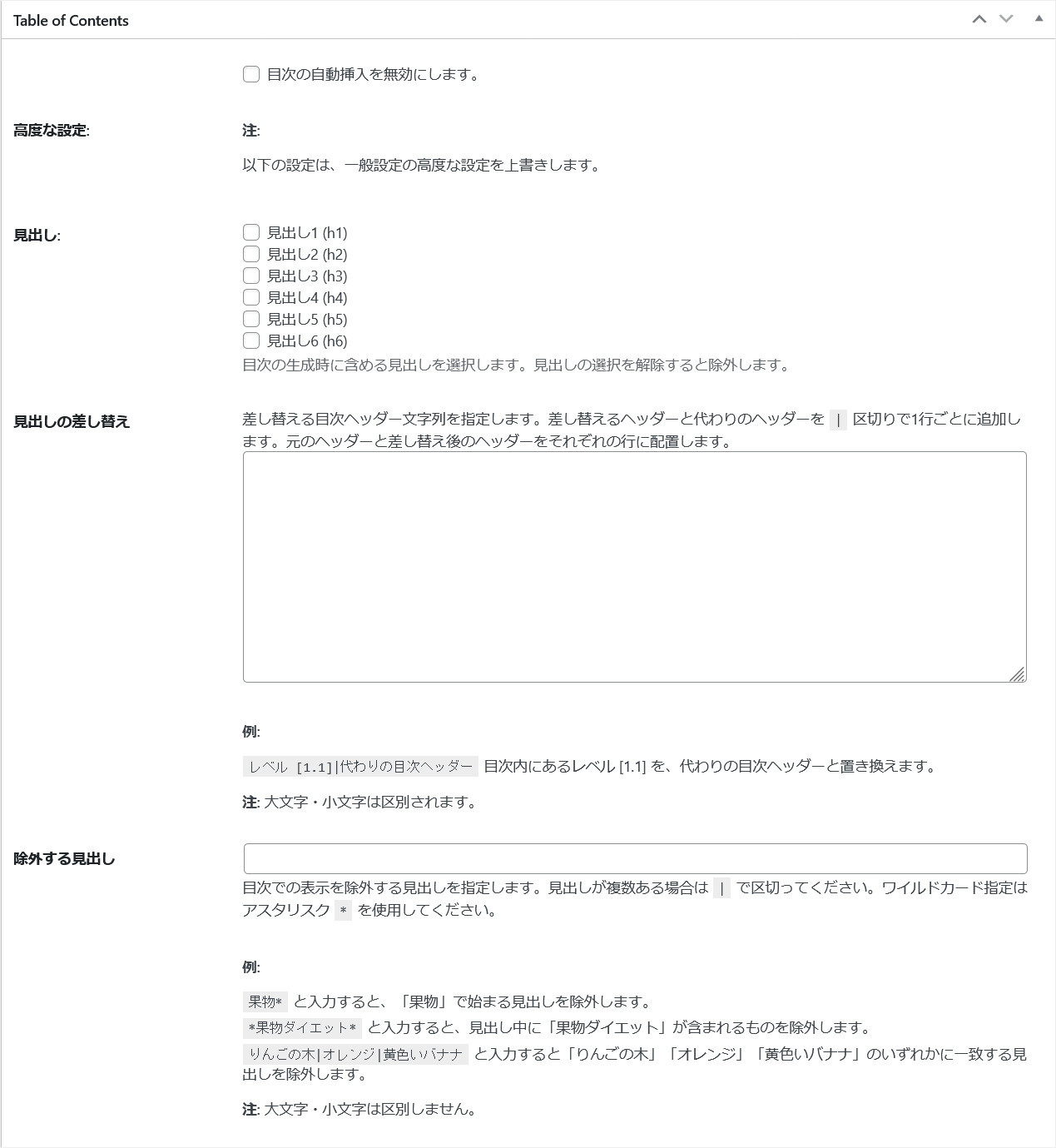 また、「見出し:」は、目次に使用する見出しタグのレベルを設定する項目になっています。
